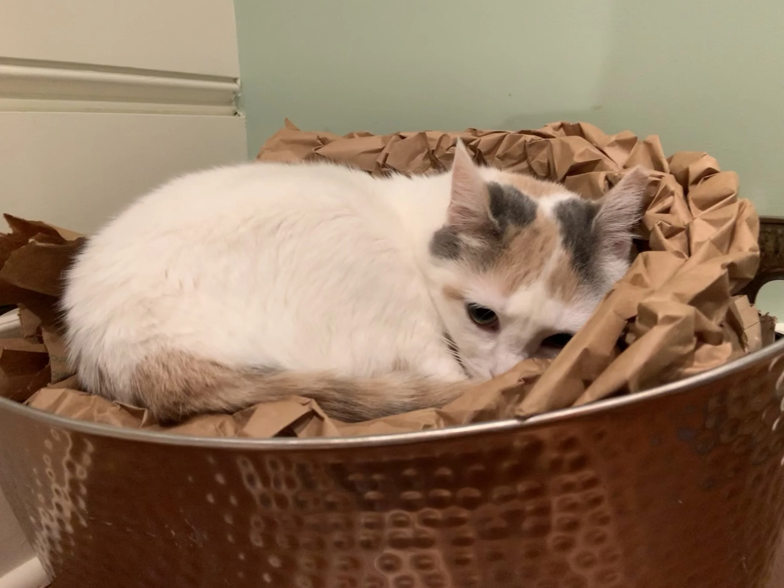 She is a gorgeous dilute calico with fur softer than a bunny, giant green eyes, and a penchant for climbing up whatever she can get her paws on. She loves having her cheeks and chin scratched and—if you’re lucky—she’ll bless you with her gravelly, pigeon-like purr.