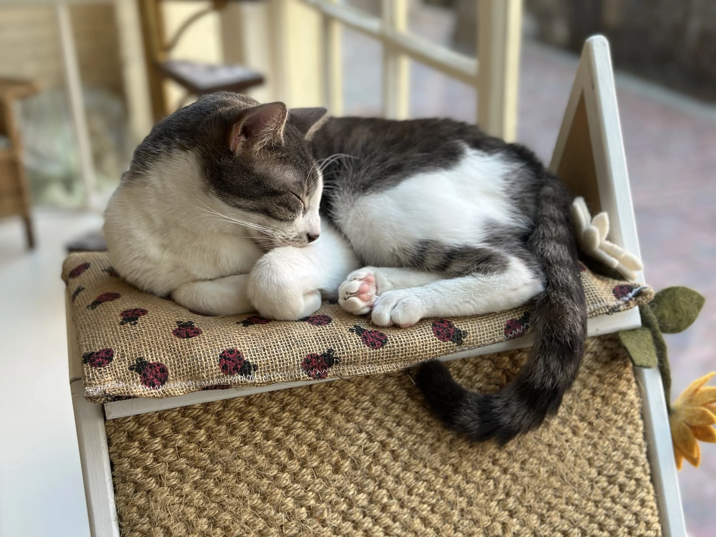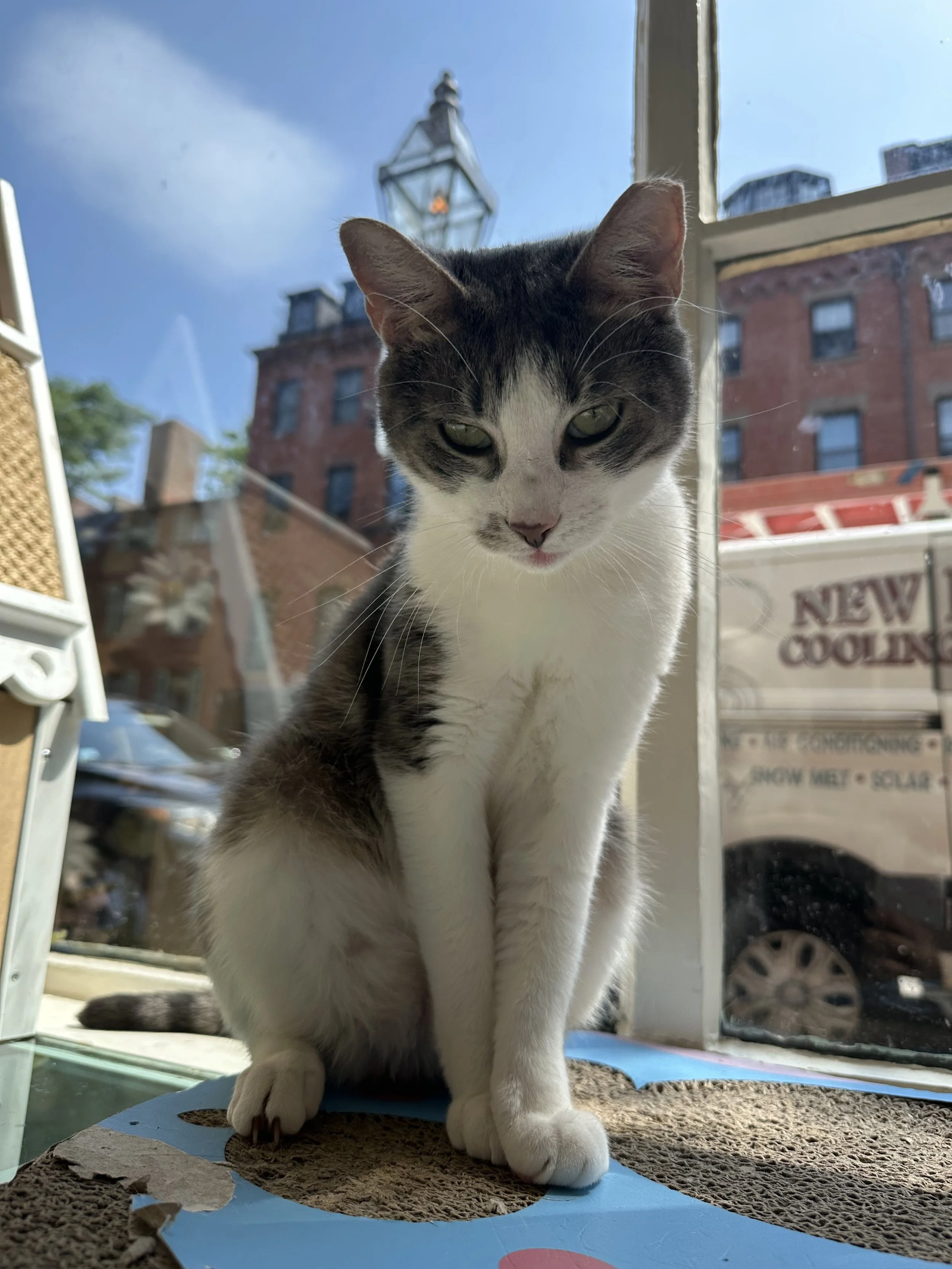 Stanley came to A Sanctuary Cafe as part of a family of eight cats. They were all relocated to Boston after being rescued from an overcrowding situation in Florida. Already familiar with being in close quarters with cats, they quickly found their footing amongst our other resident cats and bonded with their new human family as well.