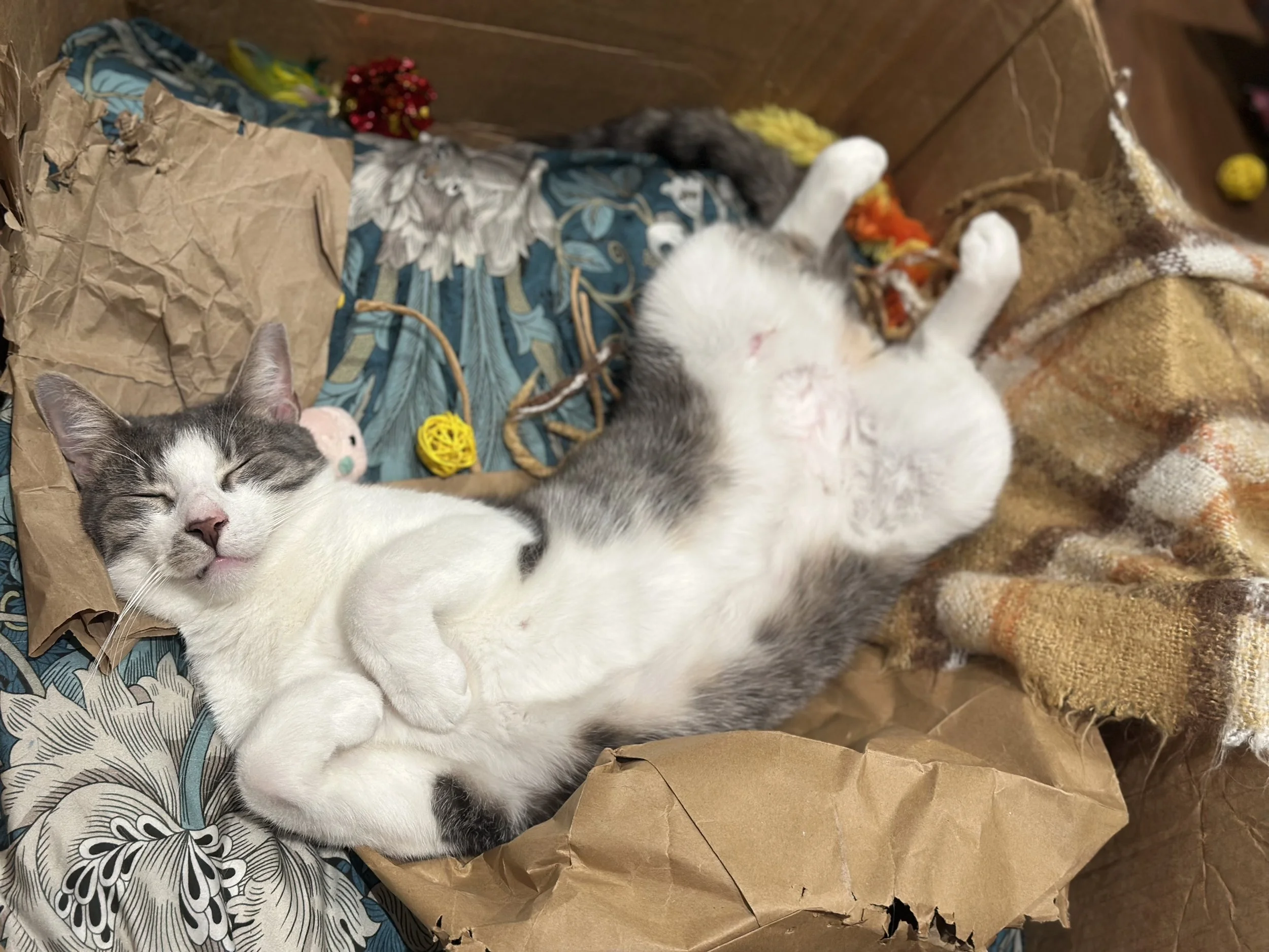 A lanky boy with long limbs and big, expressive eyes, Stanley reminds us of a newborn deer or fantastical creature of the forest. He is a proud hunter of all string and worm toys, stalking his prey by peeking around boxes or furniture before pouncing with all his might.